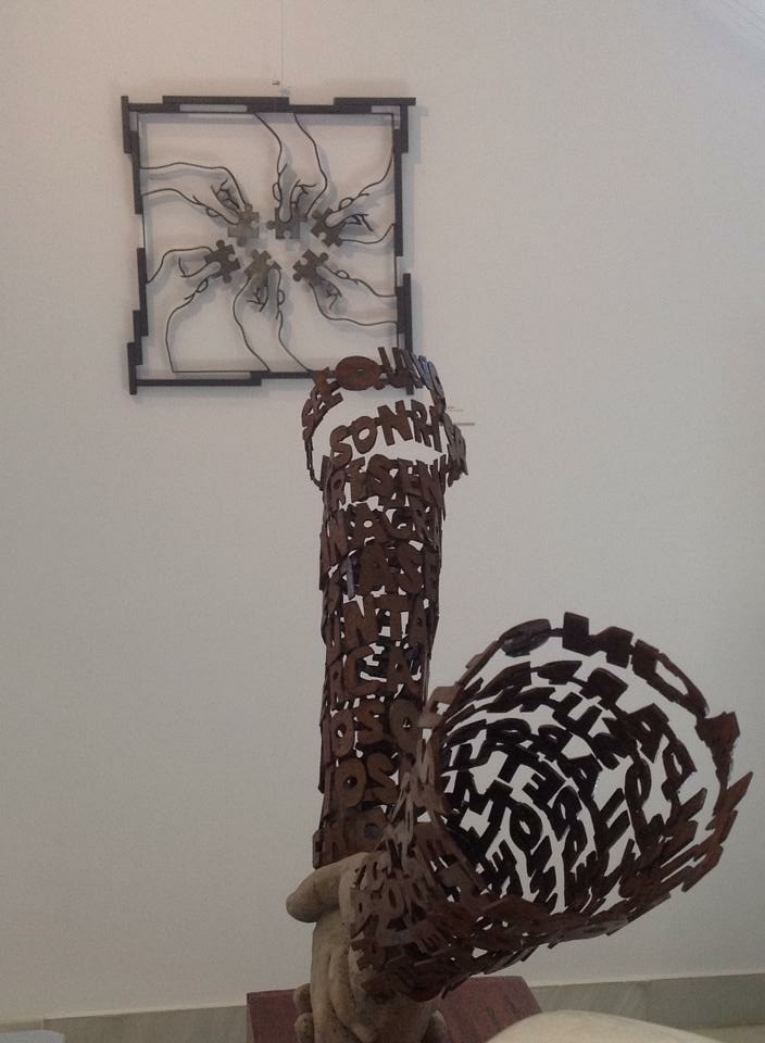 Escultura forjada con letras de acero simulando unos brazon, en ellos se puede leer parte de la siguiente poesia que un dia escribí.